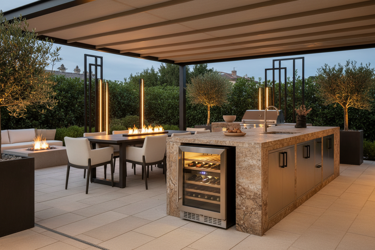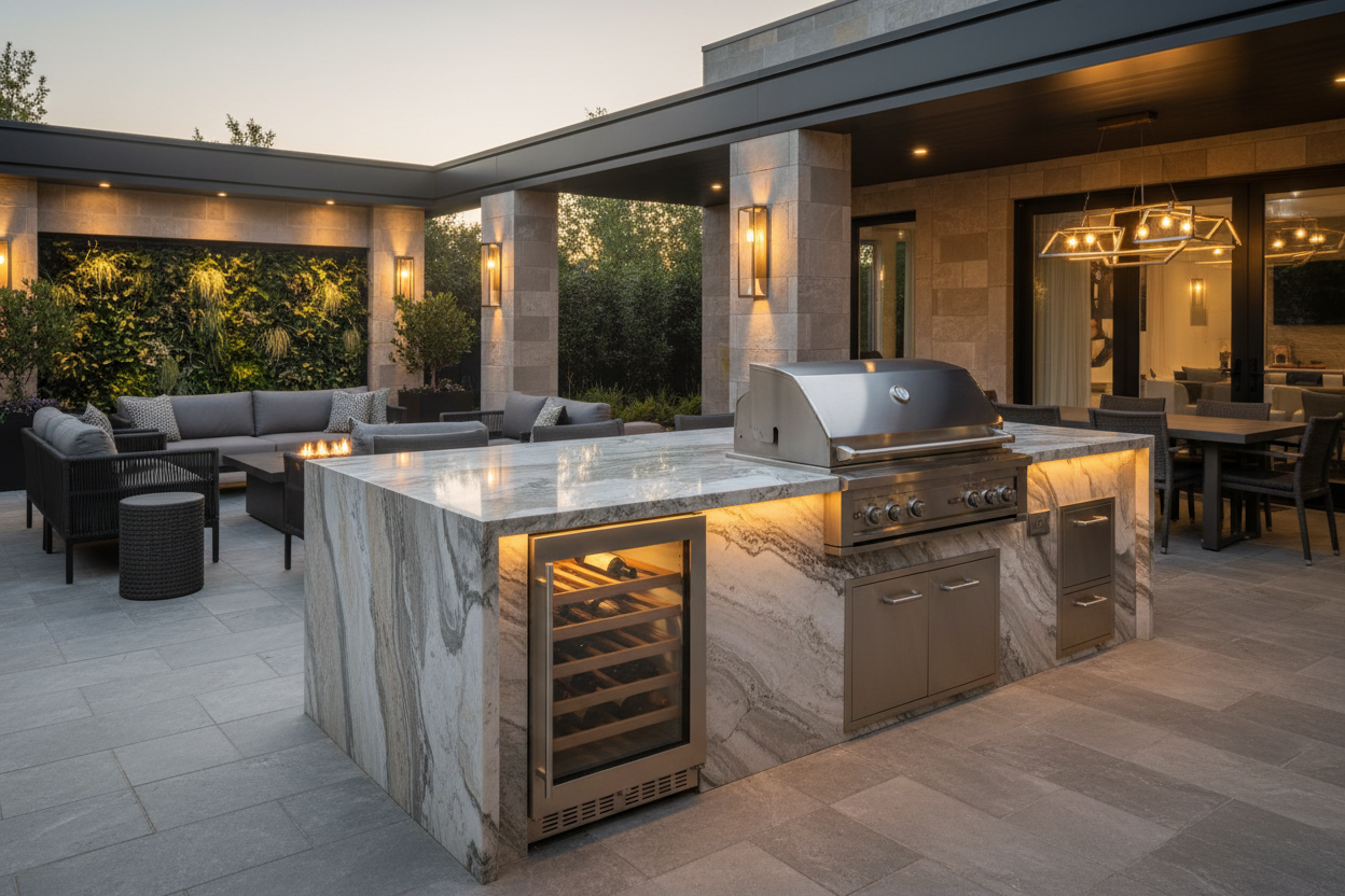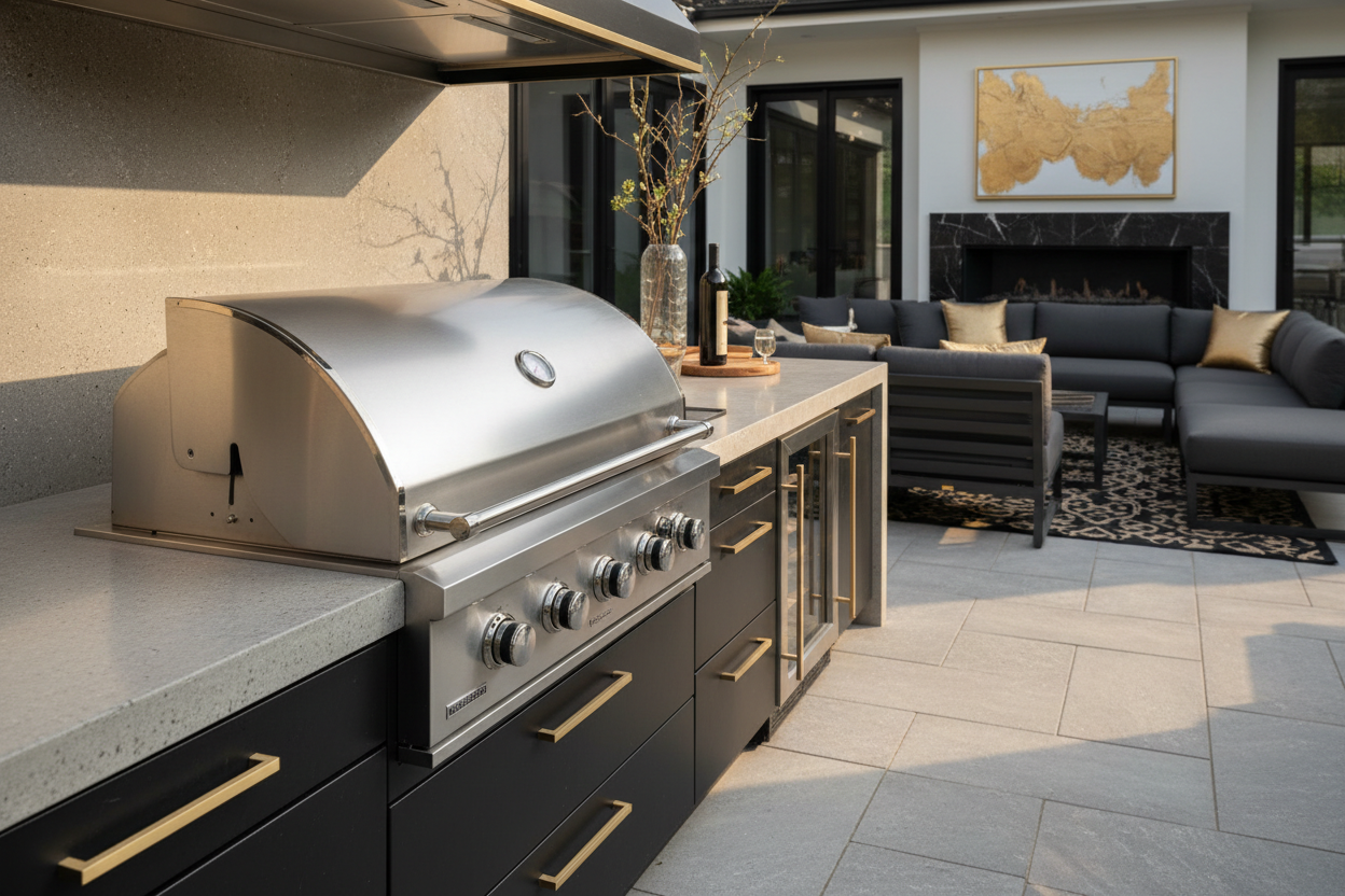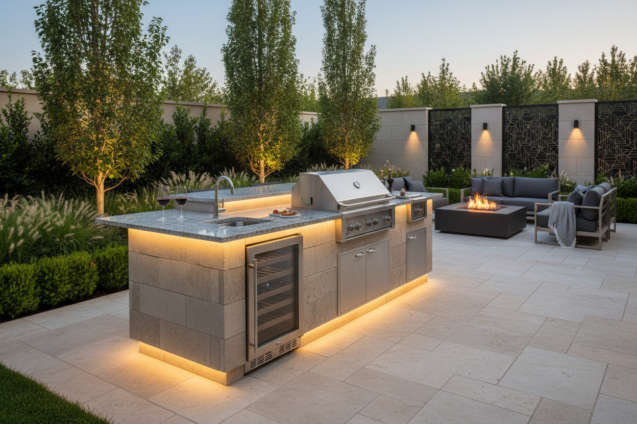 Warm sunset light frames a refined outdoor kitchen, creating a space designed for connection, comfort, and elevated backyard living.